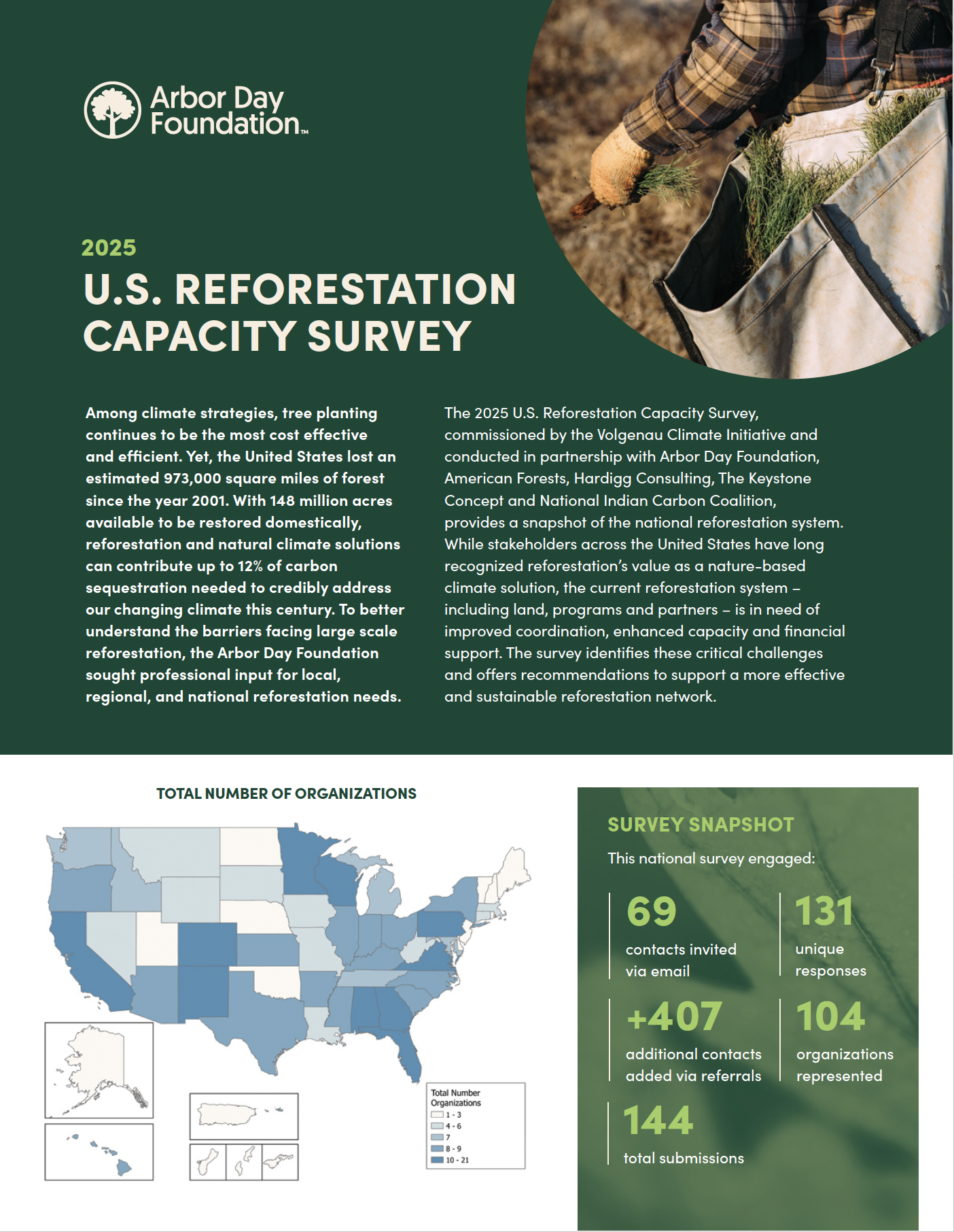 The US Reforestation Capacity Survey, funded by Volgenau Climate Initiative and led by Arbor Day Foundation, Hardigg Solutions and TKC, provided a landscape view of the current challenges and opportunities facing the reforestation space across the US. The findings of the final report showcase critical strengths and weaknesses in the current network of reforestation partners that, when leveraged and addressed, will help strengthen the efficiency and effectiveness of reforestation as a proven nature-based solution to mitigate climate change across the United States.