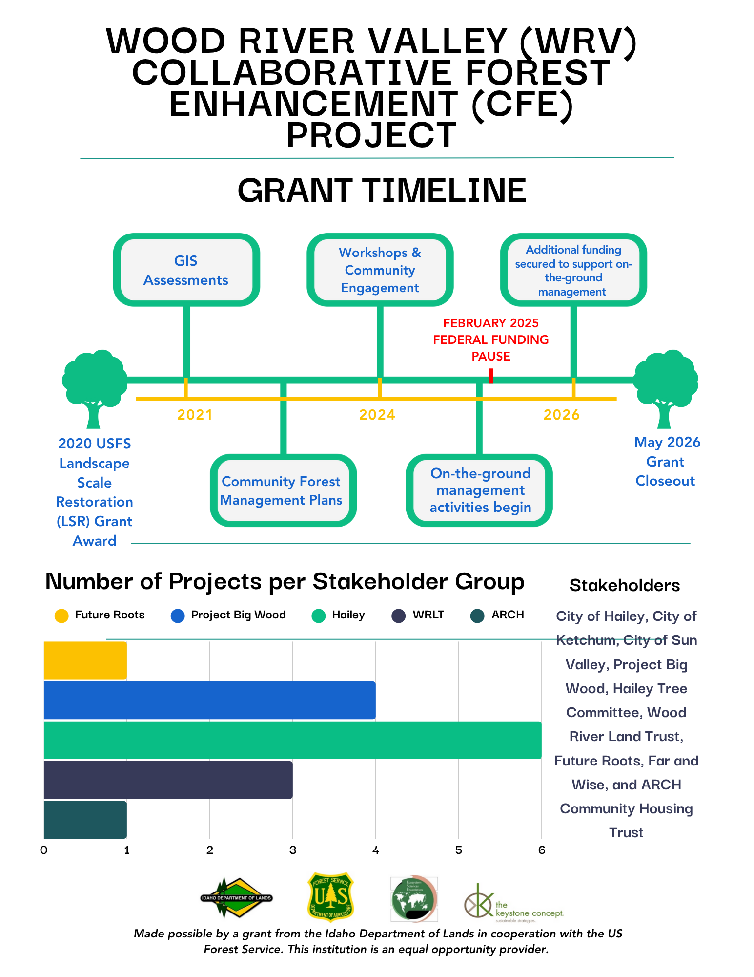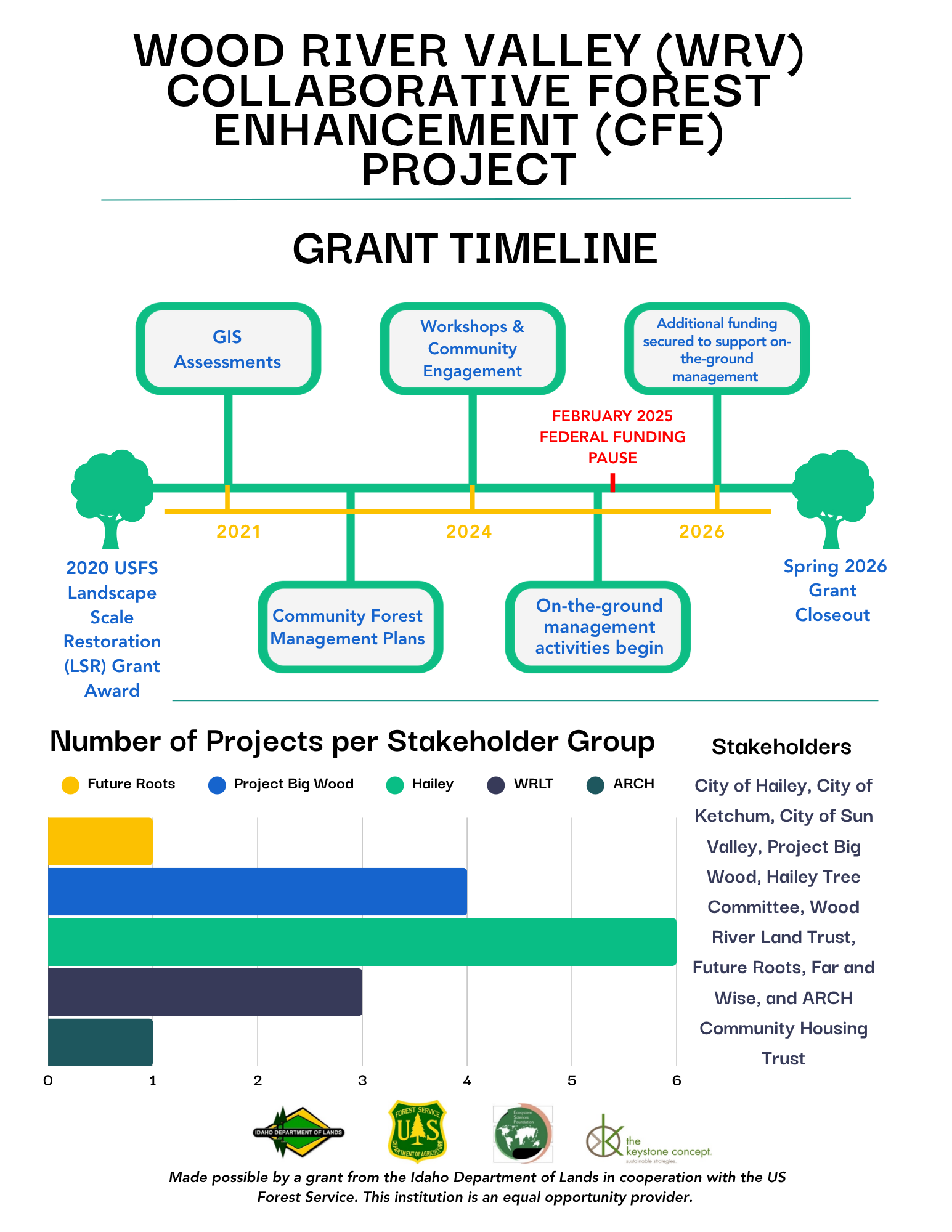 Launched in 2021, the Wood River Valley (WRV) Collaborative Forest Enhancement (CFE) Project—funded through a Landscape Scale Restoration (LSR) grant—has brought together a diverse group of stakeholders to advance the initiative through two distinct phases: Planning and Implementation.
